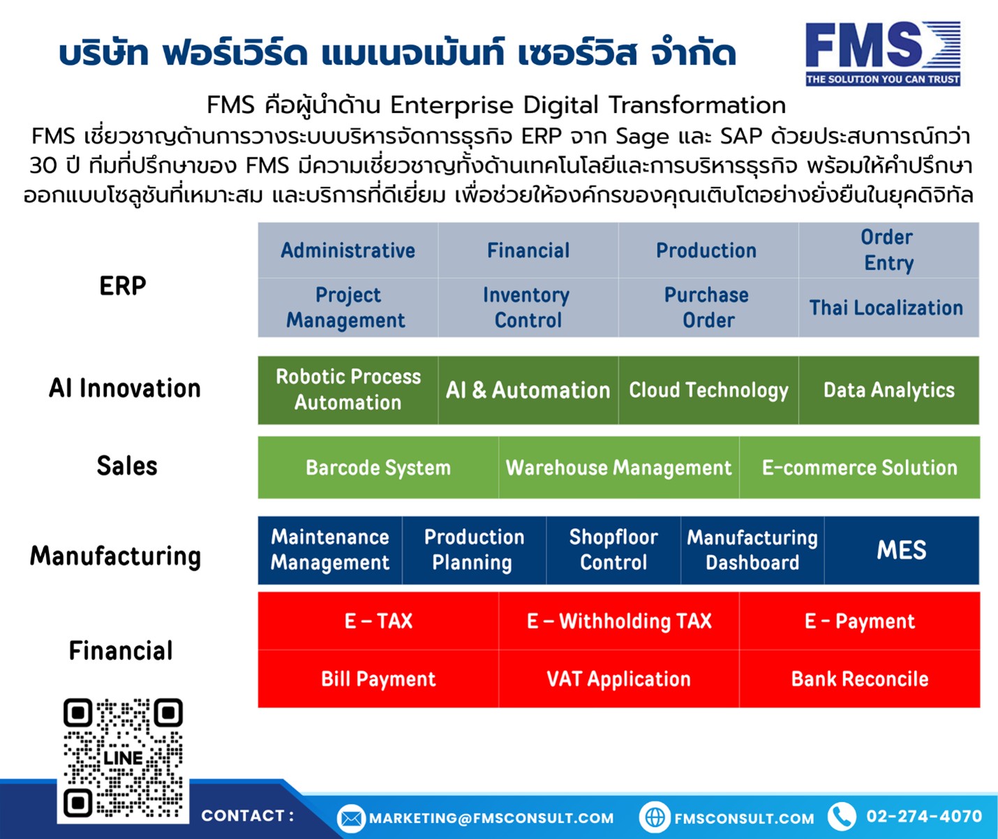 FMS เชี่ยวชาญด้านการวางระบบบริหารจัดการธุรกิจ ERP จาก Sage และ SAP ด้วยประสบการณ์กว่า 30 ปี ทีมที่ปรึกษาของ FMS มีความเชี่ยวชาญทั้งด้านเทคโนโลยีและการบริหารธุรกิจ พร้อมให้คำปรึกษา ออกแบบโซลูชันที่เหมาะสม และบริการที่ดีเยี่ยม เพื่อช่วยให้องค์กรของคุณเติบโตอย่างยั่งยืนในยุคดิจิทัล หากท่านสนใจปรึกษา สามารถติดต่อได้ที่ 02-274-4070 หรือ Line : @fmsconsult